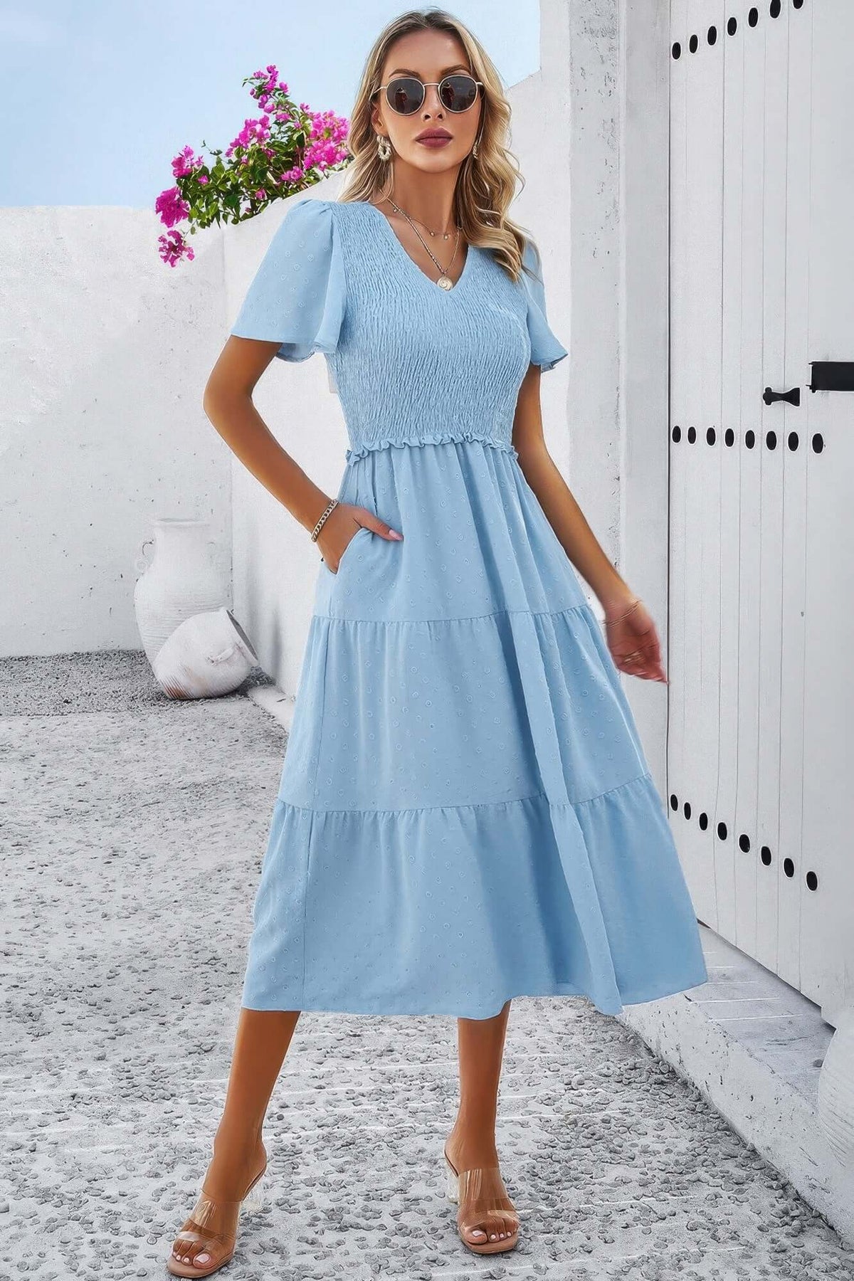 Elegante y refinado, este elegante vestido plisado está diseñado para realzar cada detalle. El escote en V fruncido y las mangas cortas realzan la silueta, mientras que la falda plisada aporta movimiento y textura. Hecho 100 % poliéster, ofrece una sensación suave y ligera, perfecta para usar tanto de día como de noche. Ya sea para una salida especial o para ocasiones cotidianas, este vestido ofrece un estilo atemporal con un toque moderno.