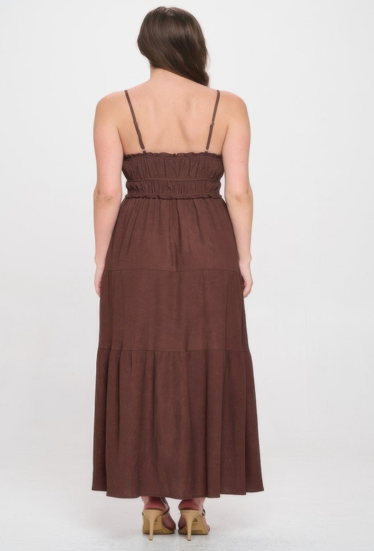¡Agrega hoy el vestido largo con frente atado y textura arrugada Plus en marrón a tu guardarropa y disfruta de la combinación perfecta de estilo, comodidad y versatilidad!