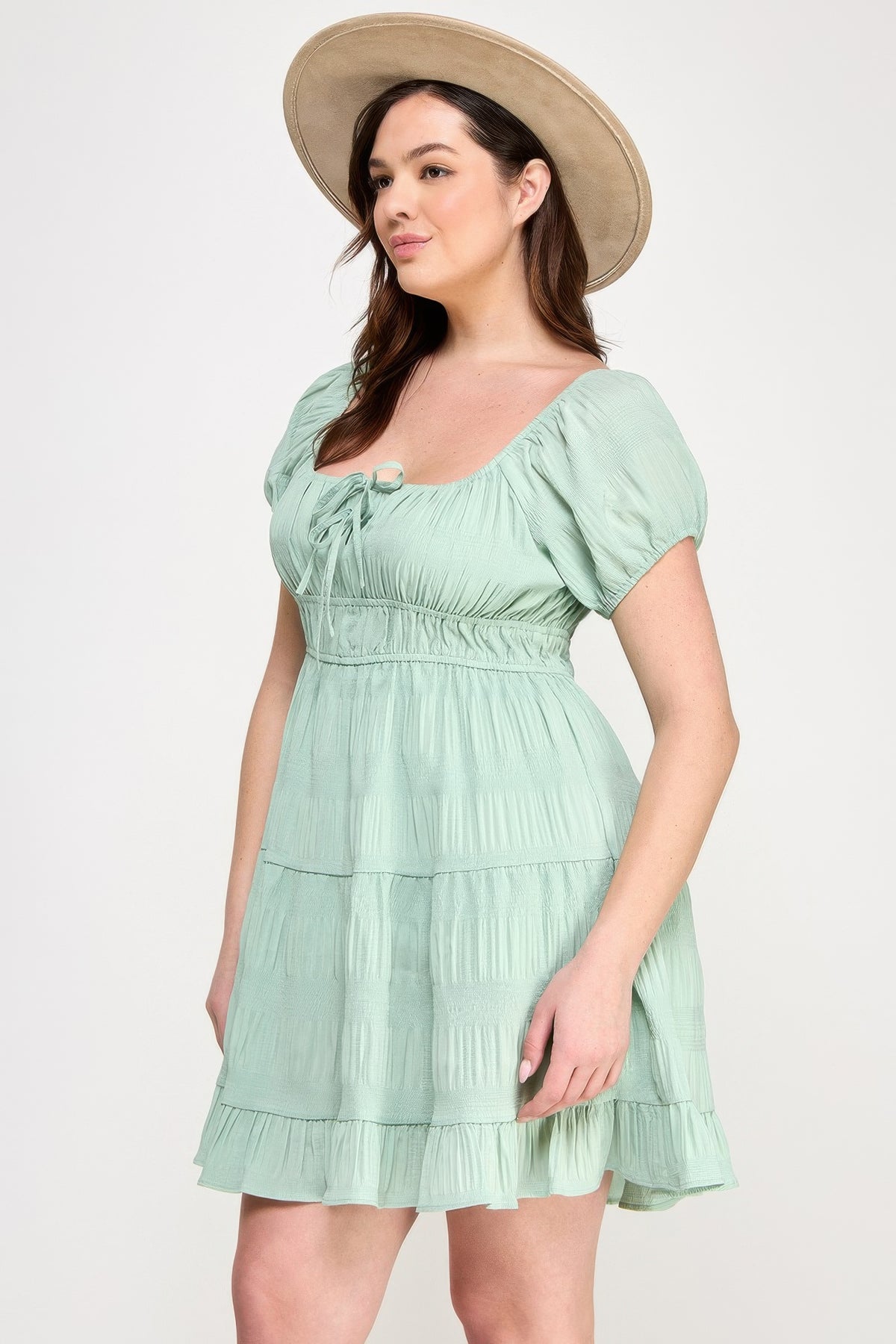¡Agrega hoy el minivestido con lazo frontal texturizado y arrugado Plus en espuma de mar a tu guardarropa y disfruta de una combinación perfecta de estilo, comodidad y versatilidad!