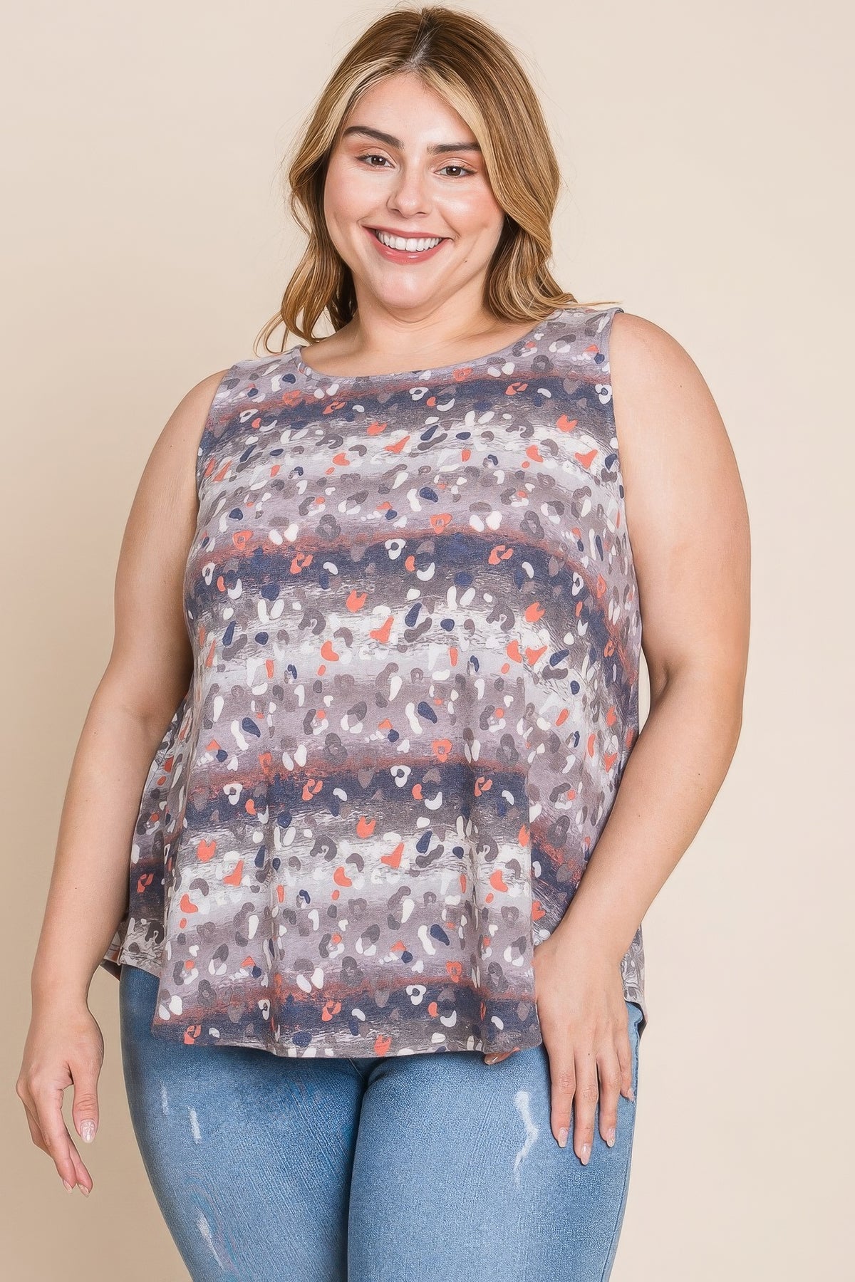 Nuestra túnica sin mangas con estampado animal tie-dye multicolor para tallas grandes destaca por su diseño llamativo y su tejido de alta calidad. El exclusivo estampado animal tie-dye le da un toque moderno, mientras que el corte holgado y el dobladillo lateral curvado crean una silueta favorecedora y cómoda. Combina a la perfección moda y comodidad, convirtiéndola en una prenda imprescindible para cualquier armario de tallas grandes.