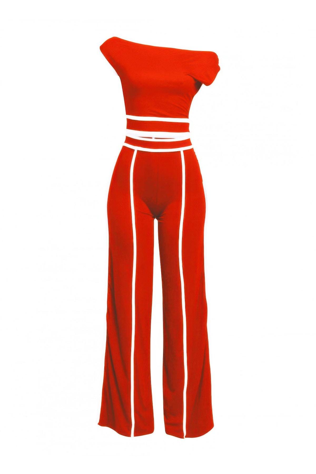 • El conjunto de dos piezas incluye un top con hombros descubiertos y pantalones de pierna ancha.