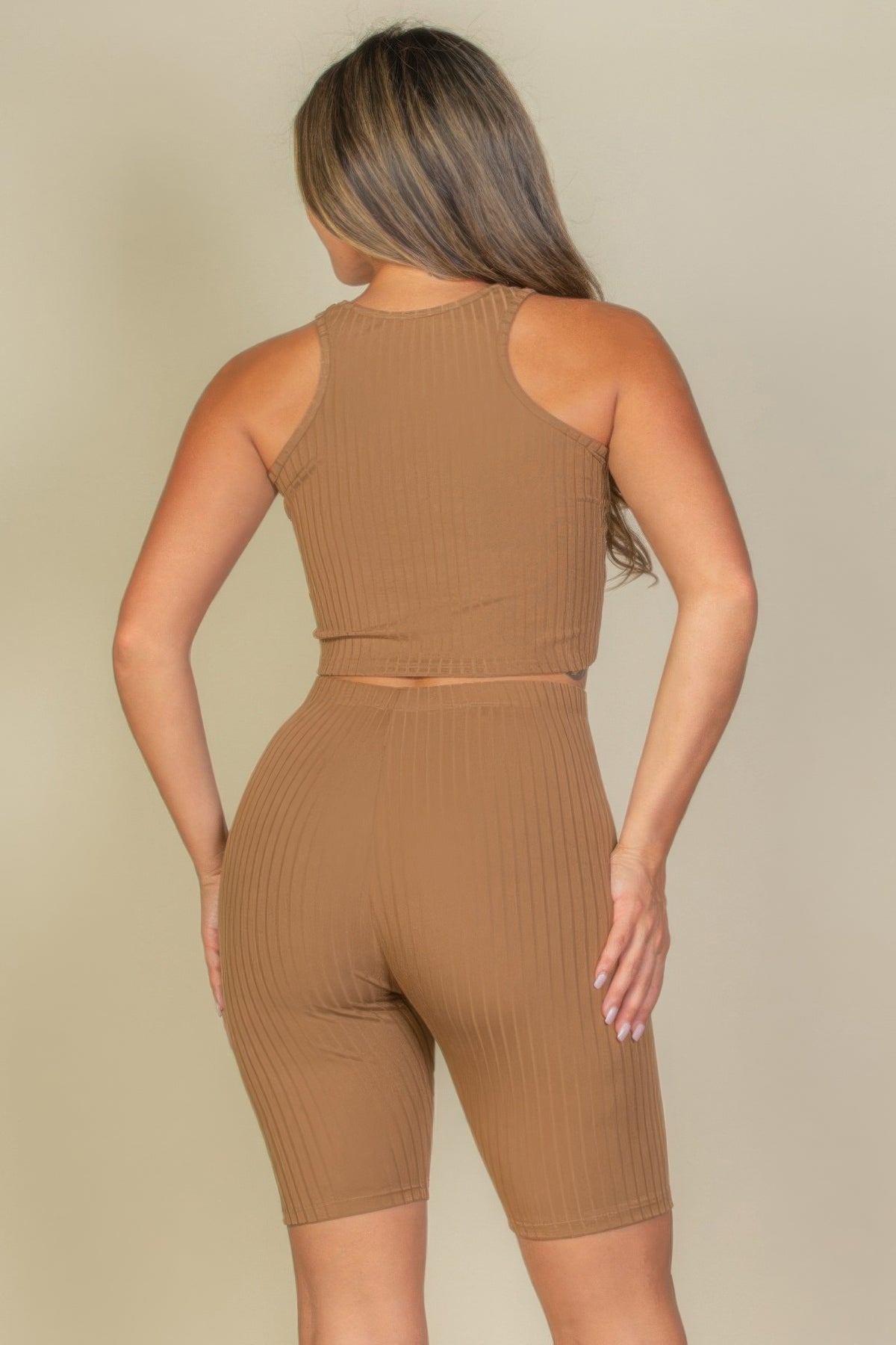 El conjunto de camiseta corta acanalada sin mangas y shorts de ciclista combina a la perfección comodidad y estilo para un look casual. Confeccionado en tejido de punto acanalado suave, ligero y muy elástico, este conjunto garantiza un ajuste transpirable y flexible que se adapta a tus movimientos. Ideal para relajarse, hacer recados o salidas informales, ofrece comodidad y una silueta favorecedora.